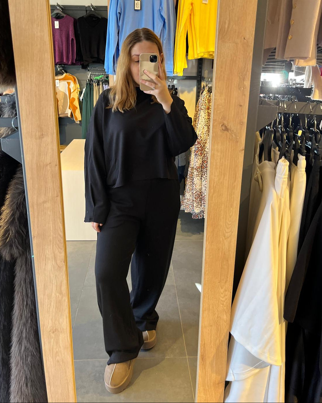 Zamansız siyah rengi ve rahat kesimiyle öne çıkan Siyah Yarasa Kol Modal Kumaş İkili Takım, konforu ve modern şıklığı bir arada sunar. Yarasa kol detaylı üst tasarımı sayesinde hareket özgürlüğü sağlarken, salaş ve zarif bir siluet oluşturur.